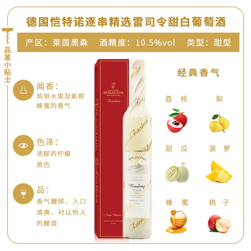 【京东商城】【食品保健】恺特诺逐串精选雷司令甜白葡萄酒 2019 礼盒装375ml