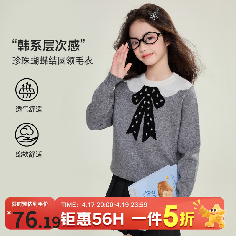 媛媛公主儿童撞色圆领毛衣26春新款女童珍珠蝴蝶结提花针织上衣中大童装 灰色 110