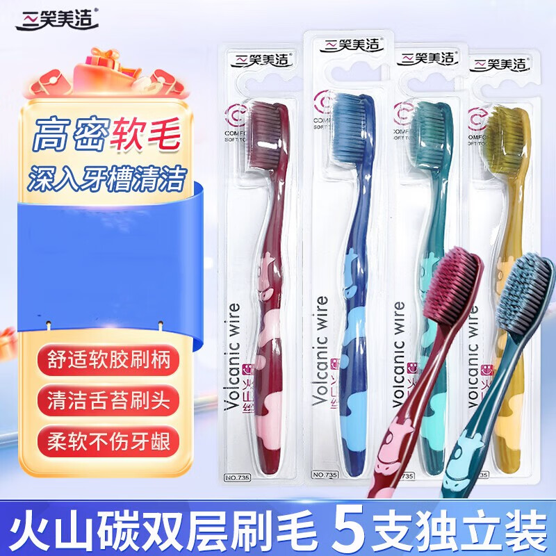 三笑美洁火山炭丝牙刷双层软毛深层清洁成人口腔护理家用独立装牙刷 软毛 5支 牙刷【颜色随机发】