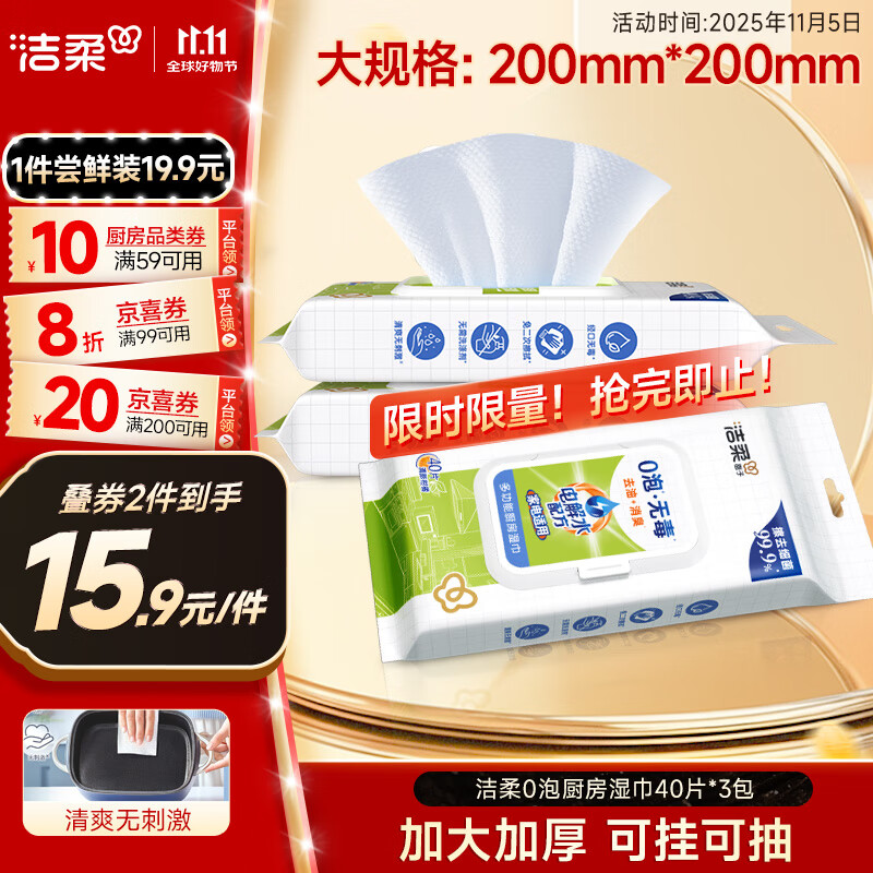 洁柔厨房湿巾去油污0泡无毒去油污悬挂抽取式大规格加厚40片3包整箱装