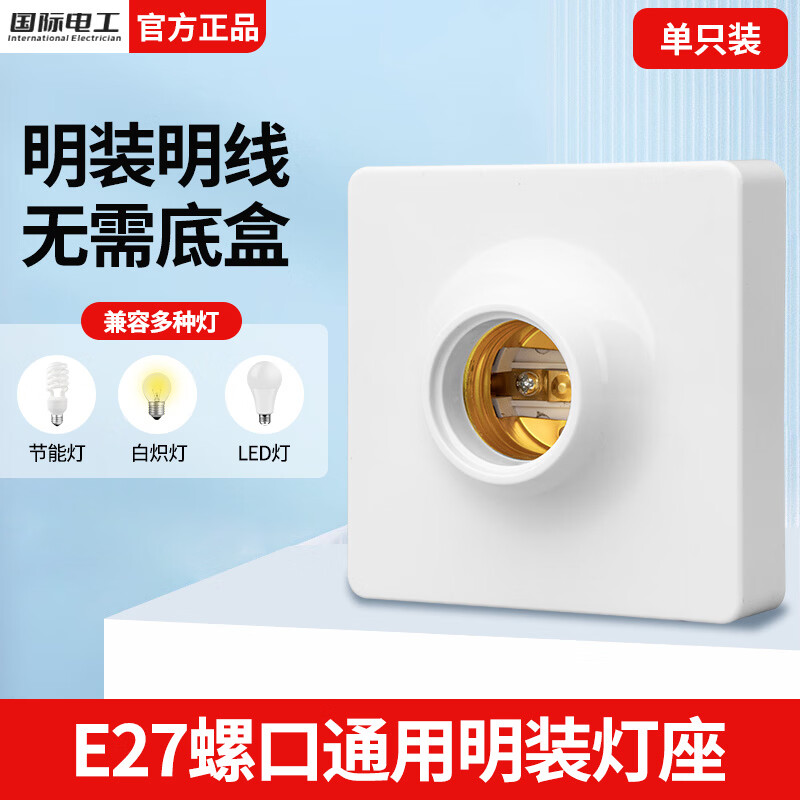 国际电工E27螺口灯座LED灯泡螺旋灯头方形螺纹灯口家用节能灯底座明装通用 白色明装灯座【1只装】