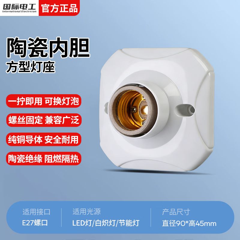 国际电工E27螺口通用型灯头陶瓷内胆灯座家用明装LED节能灯泡明线电灯底座 (陶瓷内胆)方形灯座 1只装