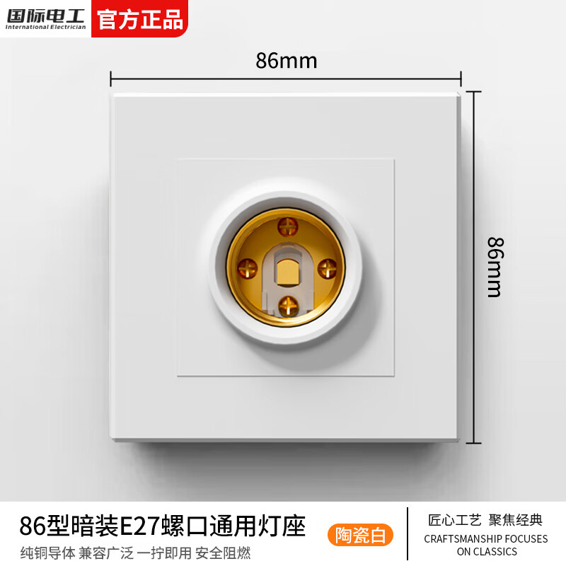 国际电工E27螺口灯头灯座家用墙壁86型暗装方形LED节能灯泡螺纹灯头 暗装灯座-白色 1只装