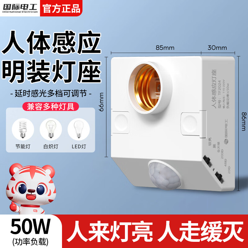 国际电工E27红外线人体感应灯座楼道走廊家用螺口明装220V感应器灯泡开关 人体感应灯座-可调节【50W】 单只装(无灯泡)