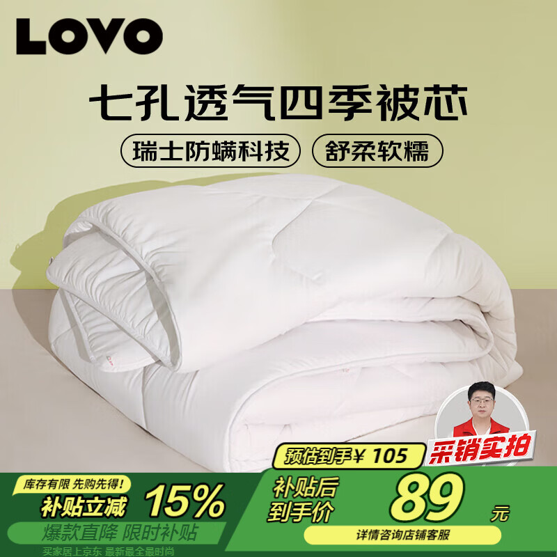 LOVO罗莱家纺 被子 防螨七孔纤维春秋被芯200x230cm 京东定制款