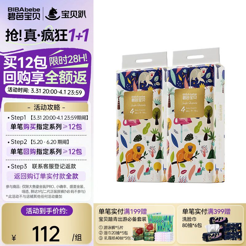 碧芭宝贝纸尿裤丛林狂想曲系列婴儿成长裤宝宝加大号尿不湿薄透气 纸尿裤L42片*2包(9-14kg)