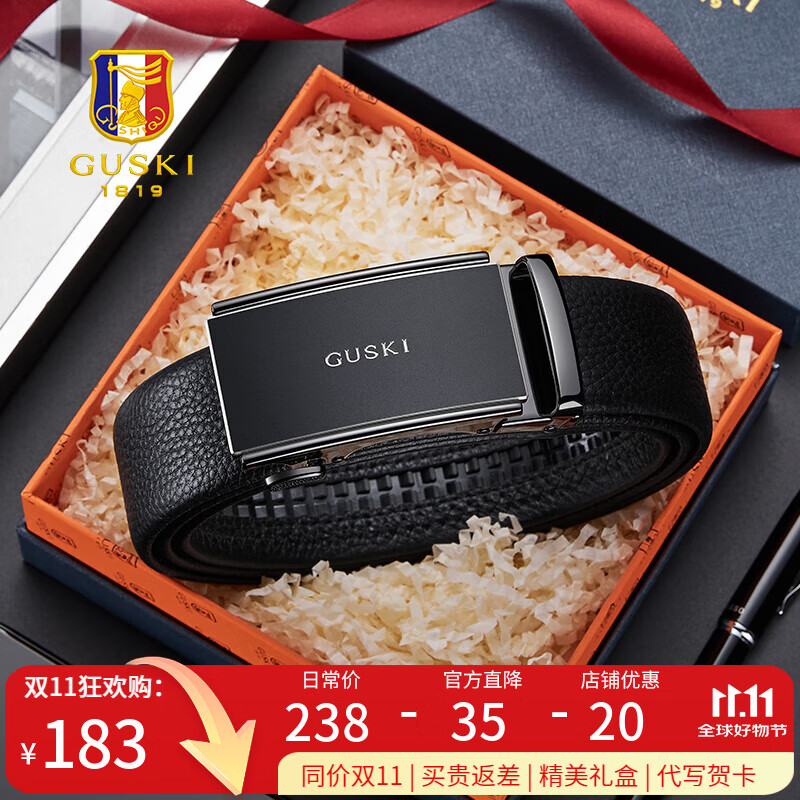 古士旗(GUSKI)法国品牌皮带男士真皮腰带牛皮自动扣高端礼盒生日礼物送男友 【专柜礼盒】枪色磨砂680066F 115cm -130cm随机长度(可修剪)