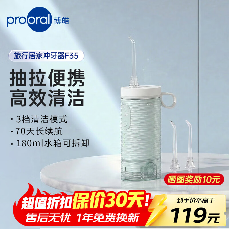 博皓(prooral)电动冲牙器便携牙齿洗牙器冲洗器家用洁牙器水牙线正畸牙垢清洁器 送朋友生日礼物 F35 青波绿