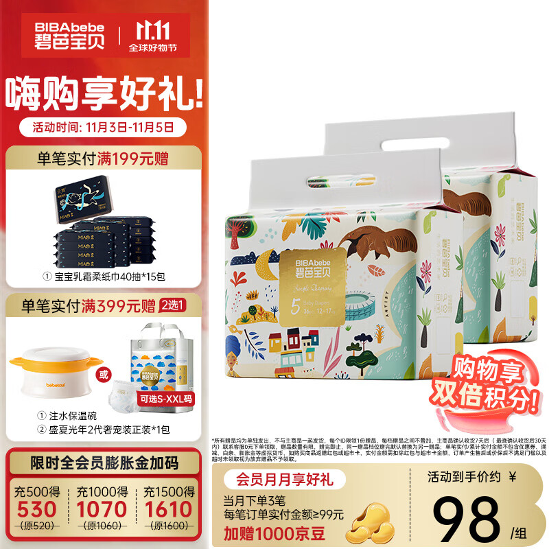 碧芭宝贝纸尿裤丛林狂想曲系列婴儿成长裤宝宝加大号尿不湿薄透气 纸尿裤XL36片*2包(12-17kg)