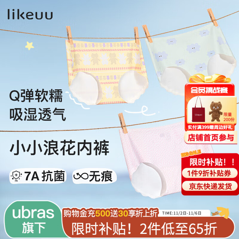 like uu ubras旗下少女无痕内裤7A抗菌浪花女童发育期初高中学生儿童内裤 【隐形无痕】2条装(白+麦) 均码 (适合150-170cm 100-130斤)