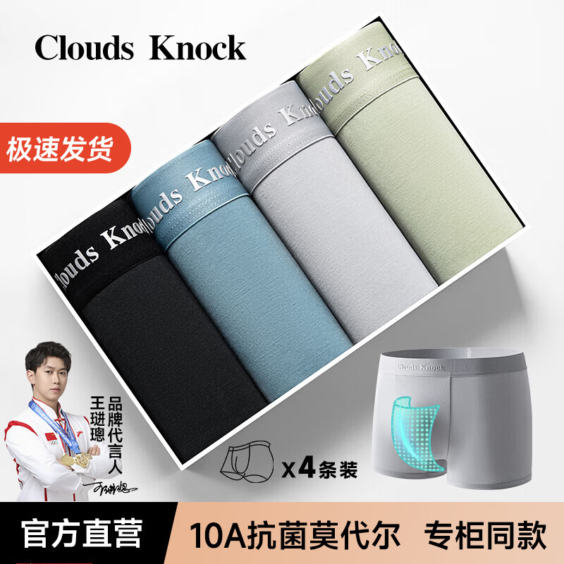 CLOUDS KNOCK男士内裤男高端奢侈莫代尔抗菌男生平角裤头男式冰丝裤衩生日礼物 专柜经典款 黑/灰/蓝/灰 莫代尔 4条装 2XL 【140-160斤以内】