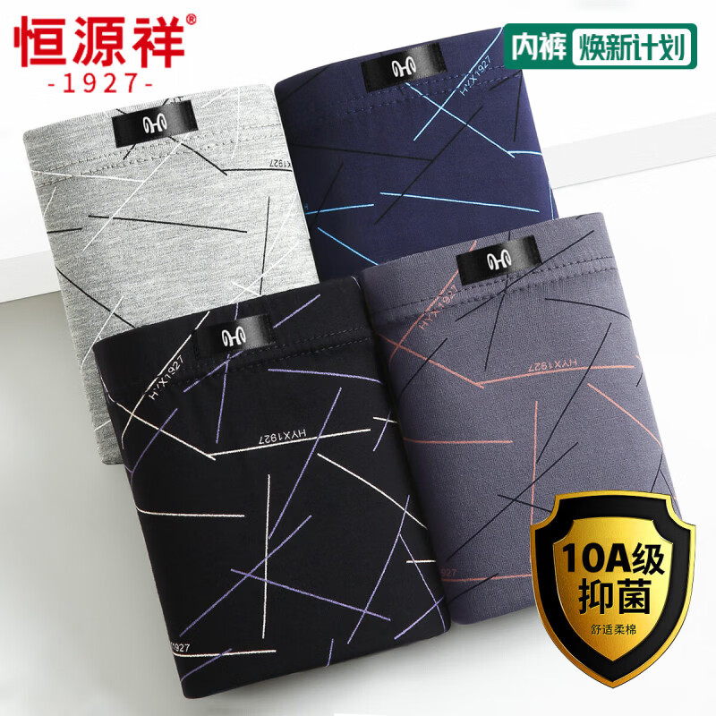 恒源祥内裤男新款男士四角裤纯棉10A植物抑菌中腰新疆棉大码平角裤头 黑色+藏青+浅灰+深灰 4条 2XL (180) 【建议120-140斤】