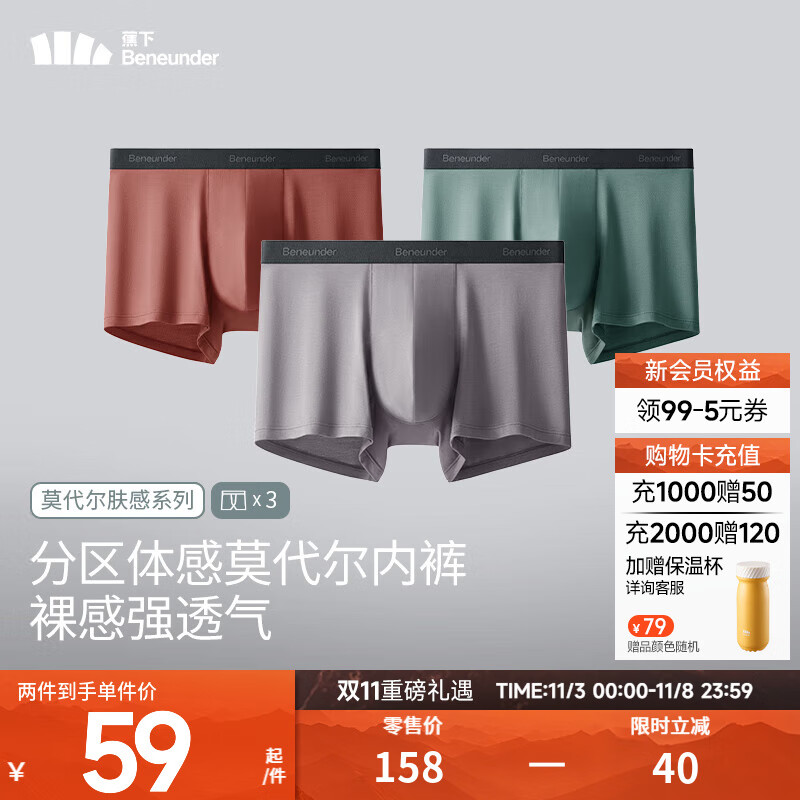 蕉下(beneunder)莫代尔男士内裤3条装无痕底裆抗菌冰丝平角裤透气运动四角裤 薄烟紫+砖木红+灰榄绿 3条 M