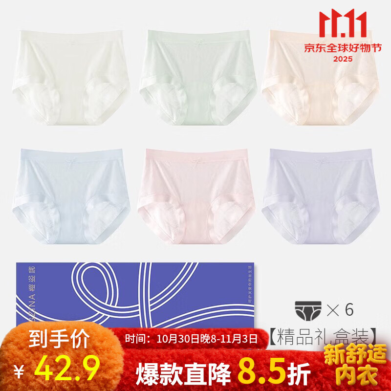 樱姿娜【6条装】无痕蕾丝内裤女性感冰丝网纱10A抗菌聚乳酸丝裆三角裤头 【6条礼盒装】肤+白+粉+紫+绿+蓝 XL 高腰(100-140斤内可穿)