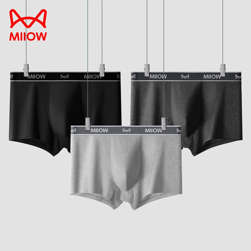 猫人3条装男士全棉内裤7A级抑菌裆中腰男式四角裤u凸短裤头宽腰内裤 黑色+黑麻灰+中麻灰 2XL (130-150斤)