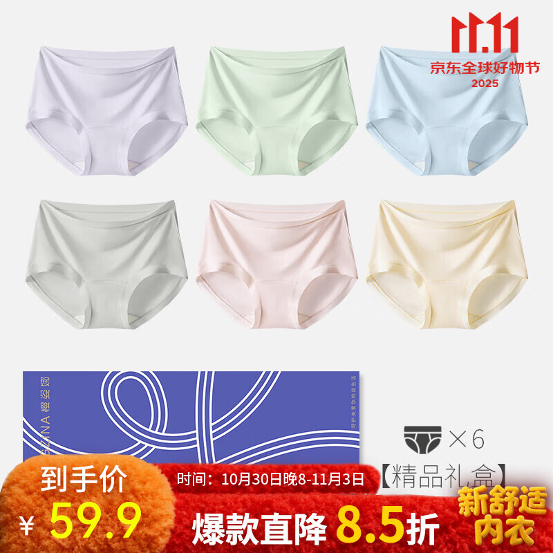 芬腾可安内裤女【7A抗菌】纯棉裆透气女士内裤日系简约少女三角裤6条装YR 浅紫 浅绿 浅粉 浅蓝 白色 肤色 6条 XL