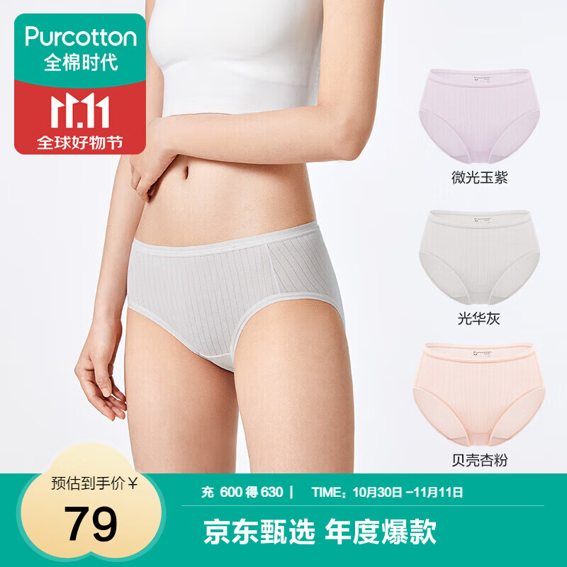 全棉时代女士内裤女肌理中腰三角无感腰头3条装短裤 贝壳杏粉+微光玉紫+光华灰 3条 L (165)
