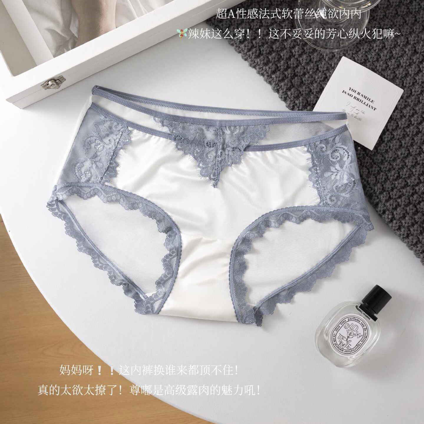 法式纯欲风/性感蕾丝内裤女2026中低腰三角裤缎面镂空桑蚕丝裆