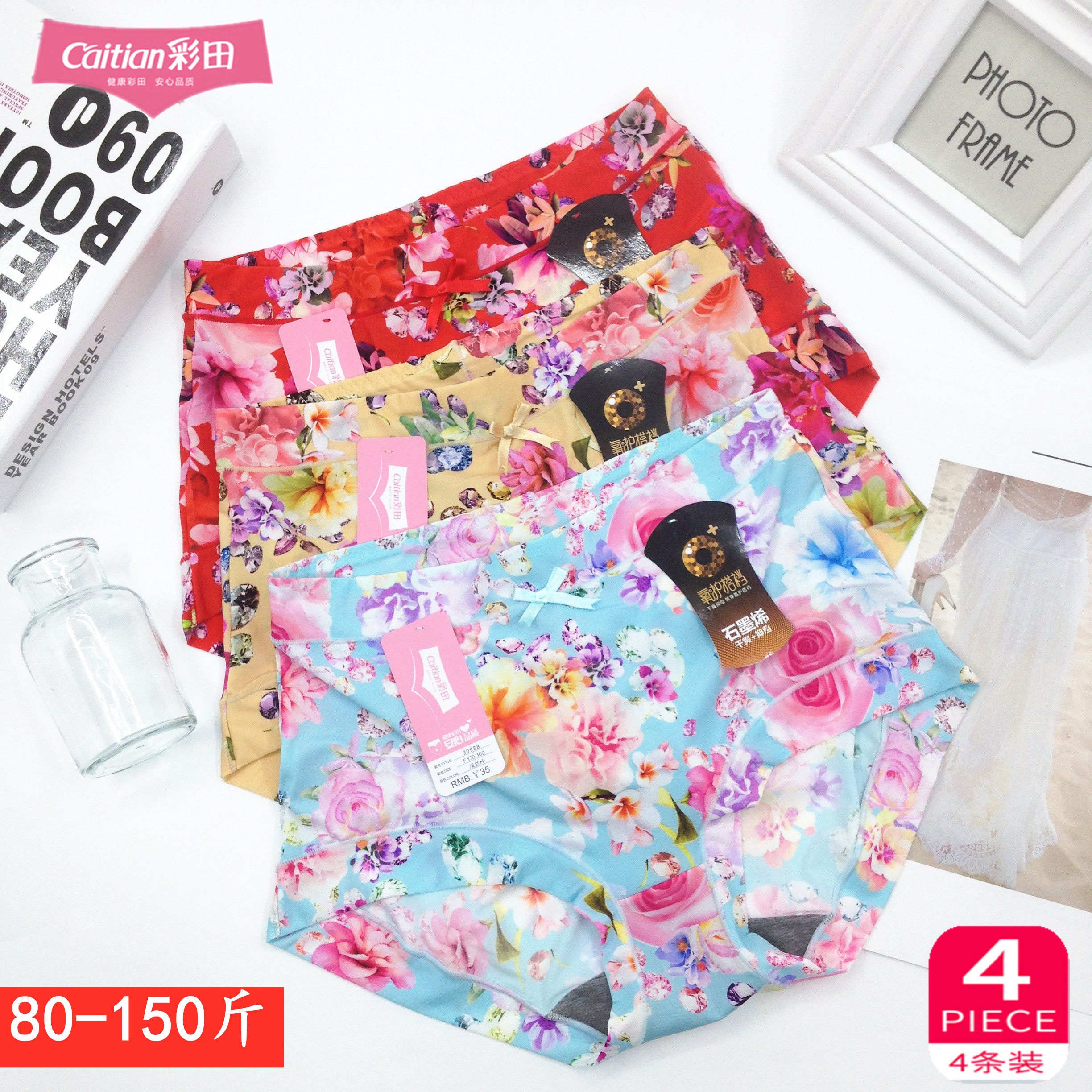 彩田内裤女冰丝印花石墨烯抗菌裆中腰女士舒适无痕高腰大码平角裤
