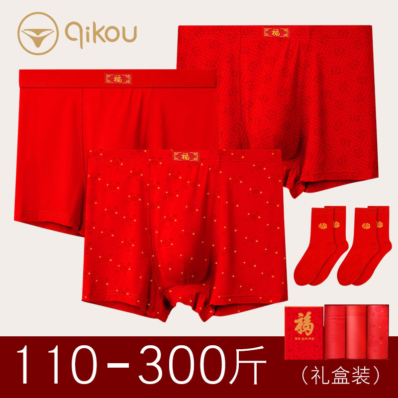 大红色内裤男士印花福运本命年结婚大尺码肥佬30R0斤无痕四角内裤