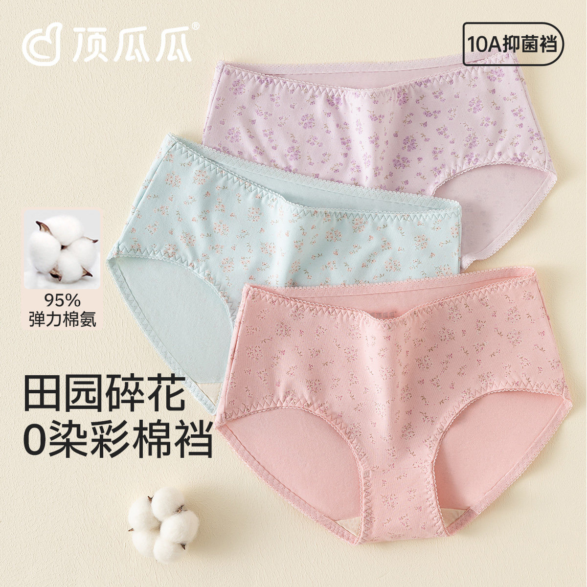 顶瓜瓜女士纯棉中腰三角内裤顶呱呱碎花印花防夹臀内裤彩棉底裆女