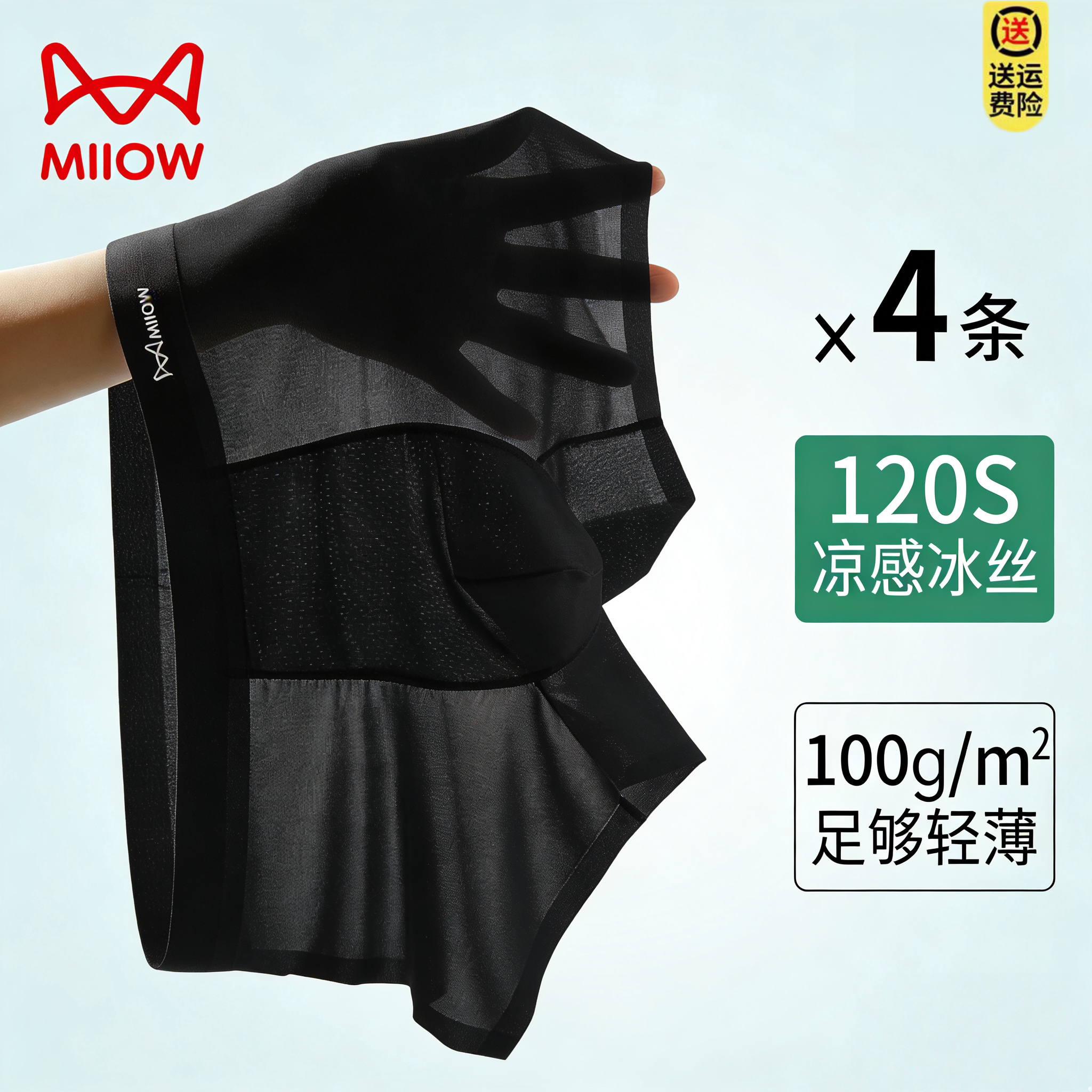 猫人黑色冰丝男士内裤无痕运动透气抗菌凉感超薄夏季平角四角短裤