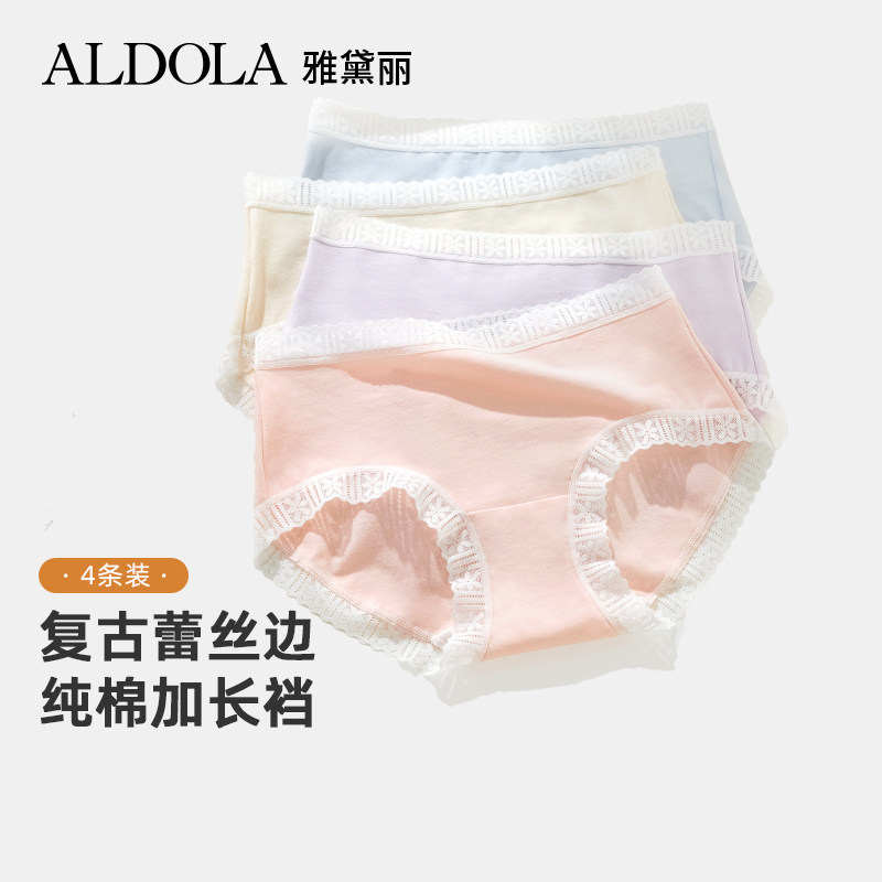 雅黛俪中腰蕾丝内裤女10A抑菌纯棉加长底档无痕隐形4条装三角短裤