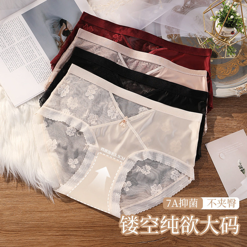 a类纯棉7a抗菌加长裆内裤大码性感镂空内裤女200斤蕾丝高级感绸缎