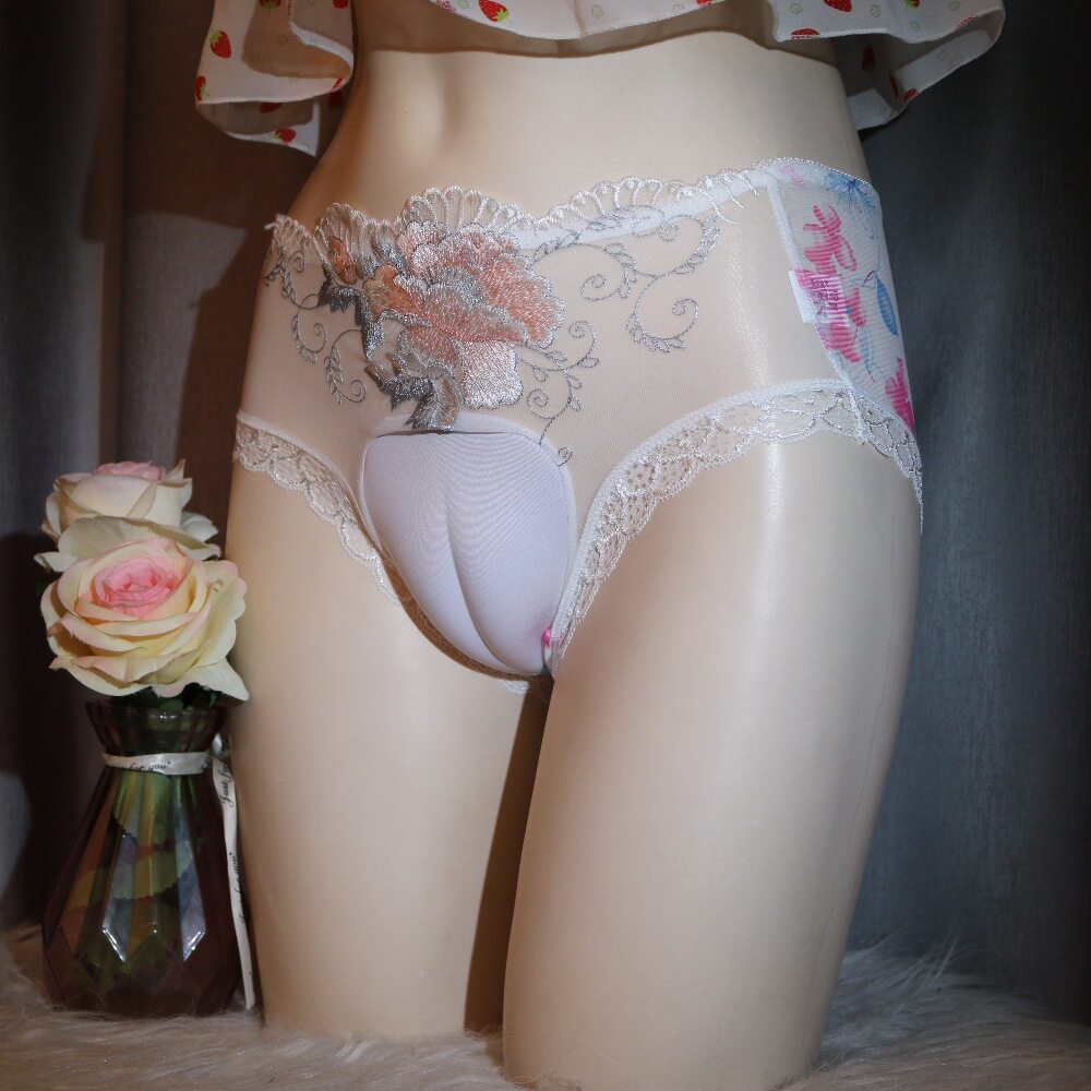 男女同款网纱刺绣鲍鱼勒痕伪娘男娘隐藏下体jj三角裤性感透明内裤