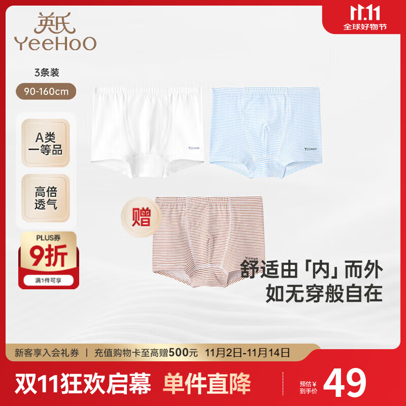 英氏(YEEHOO)儿童内裤男女宝宝四角平角抗菌打底裤不夹pp中大童柔软透气