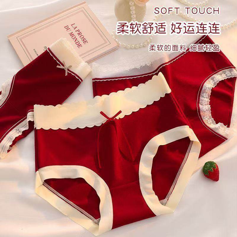本命年红色内裤抑菌透气新款女生大码结婚蕾丝花边女士三角裤喜庆