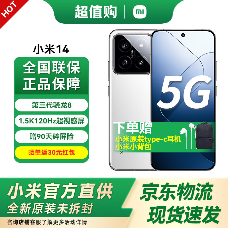 小米14【国家补贴】 5G手机小米14手机第三代骁龙8徕卡光学镜头光影猎人900手机小米澎湃OS 16GB+512GB 白色 全网通