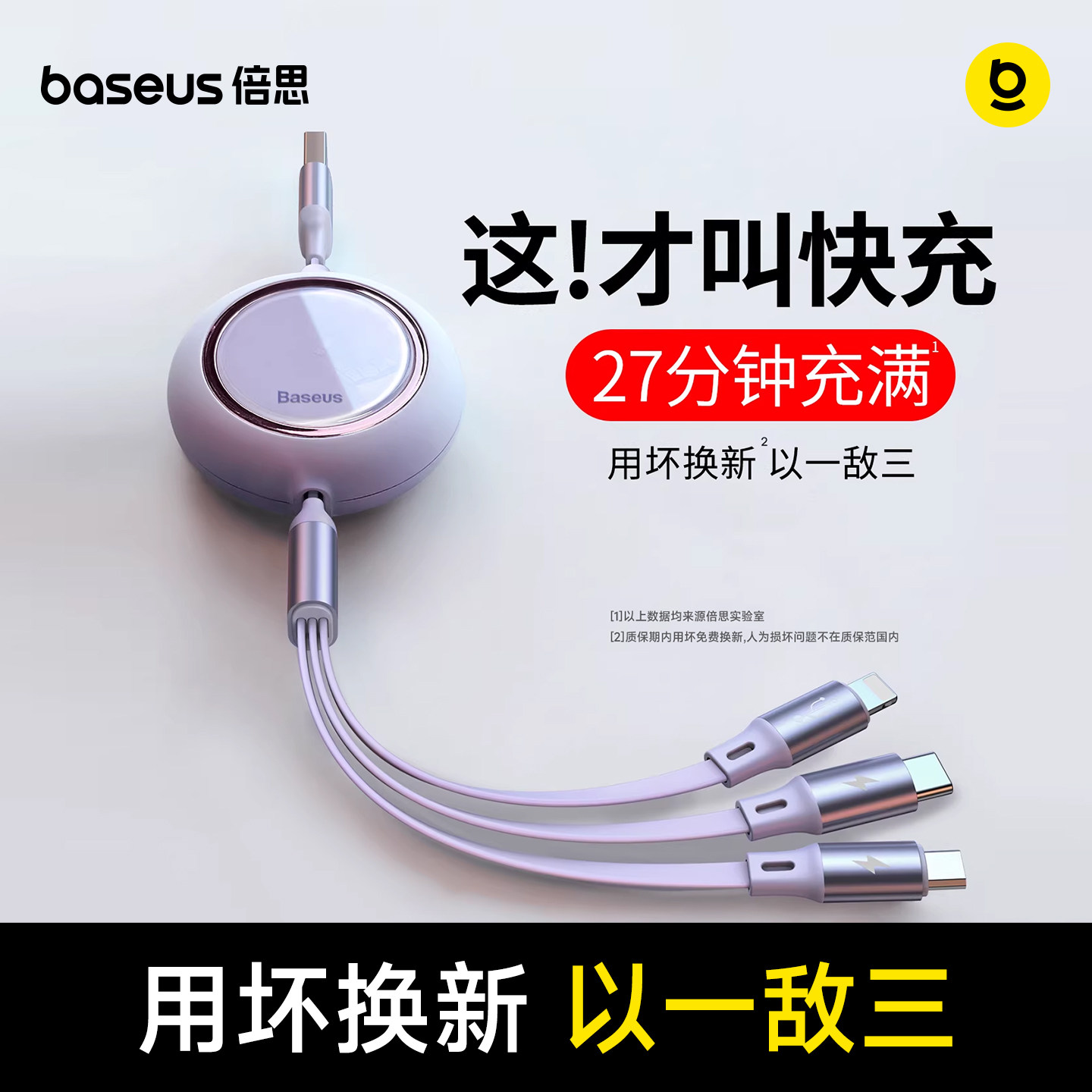 倍思数据线三合一充电线器一拖三快充三头适用多头车载苹果Typec充手机车超级车用汽车USB伸缩多功能多用电器