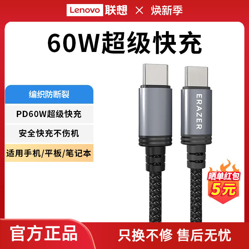 联想生态品牌异能者数据线双type-c快充线数据传输PD60W尼龙编织适用于手机平板电脑