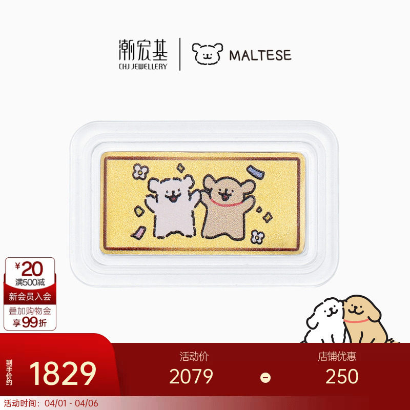 潮宏基线条小狗足金金币黄金摆件投资金手机贴正版生日礼物