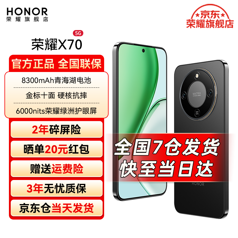 荣耀X70 新品5G手机 金标十面抗摔 IP69防水 8300mAh青海湖电池 幻夜黑 8GB+128GB【2年碎屏险】 官方标配