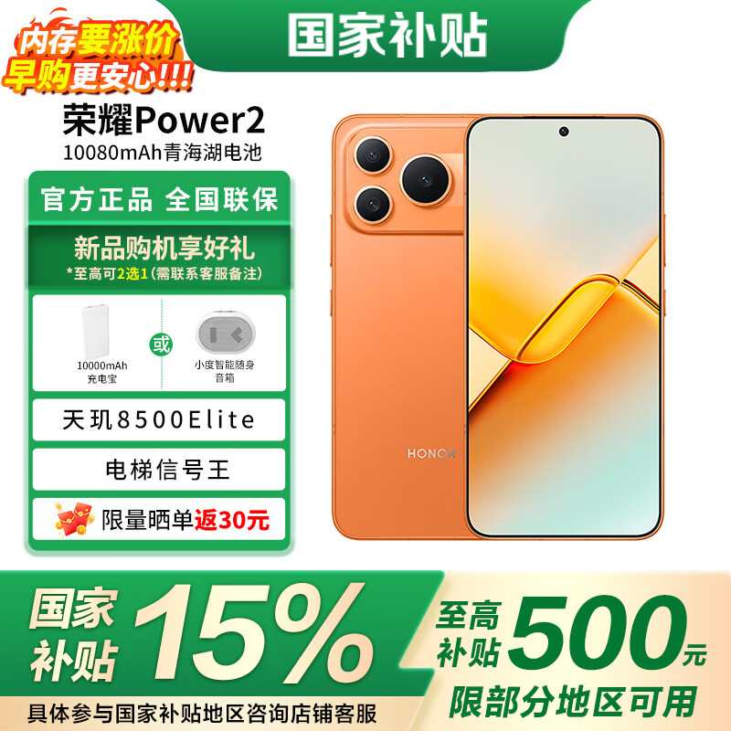 荣耀Power2 国家补贴 10080mAh青海湖电池 天玑8500 Elite 电梯信号 5G AI 长续航手机 旭日橙 12GB+256GB 官方标配