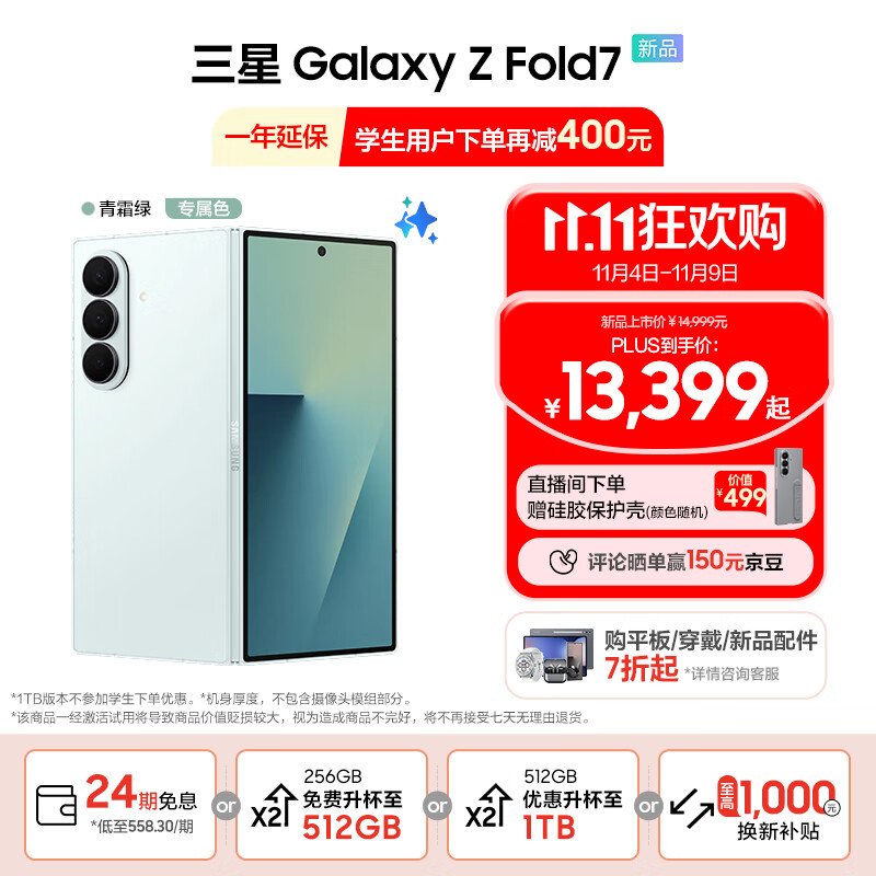 三星(SAMSUNG)Galaxy Z Fold7 超轻薄8英寸大屏2亿像素主摄 超视觉引擎 Galaxy AI 披荆斩棘哥哥同款 折叠屏手机 【专属色】青霜绿 12GB+256GB 享24期分期免息
