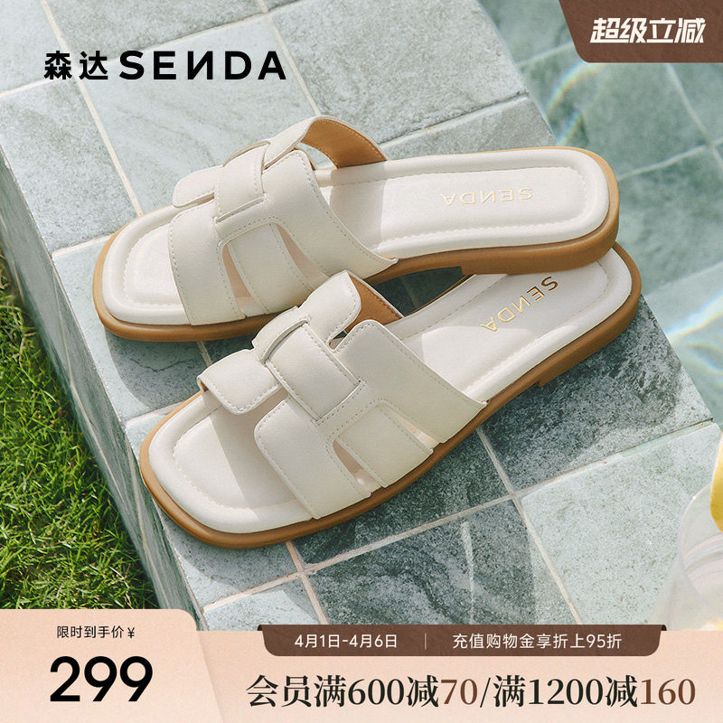 森达一字凉拖鞋女鞋外穿夏季软羊皮海边沙滩度假平底休闲罗马凉鞋