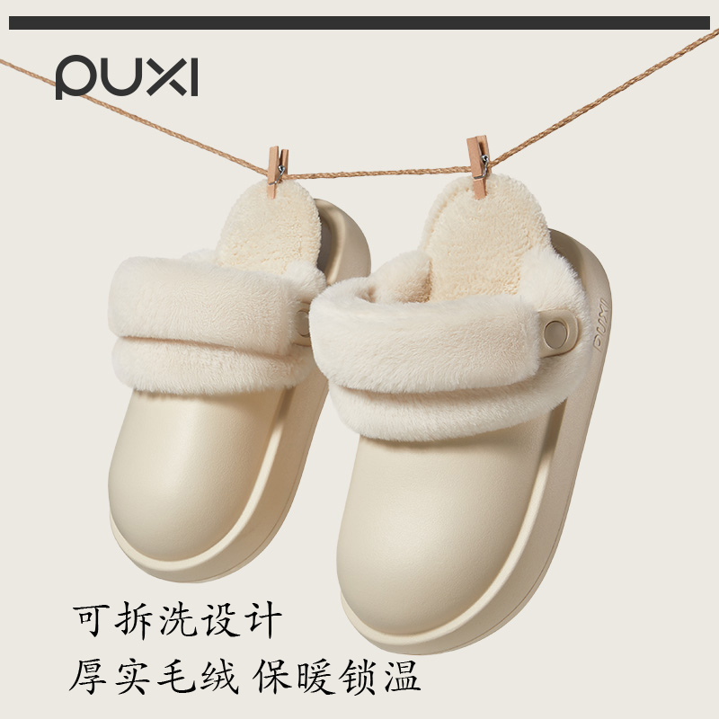 朴西松饼防水棉拖鞋女冬季居家室内防滑厚底保暖可拆卸毛绒拖鞋女