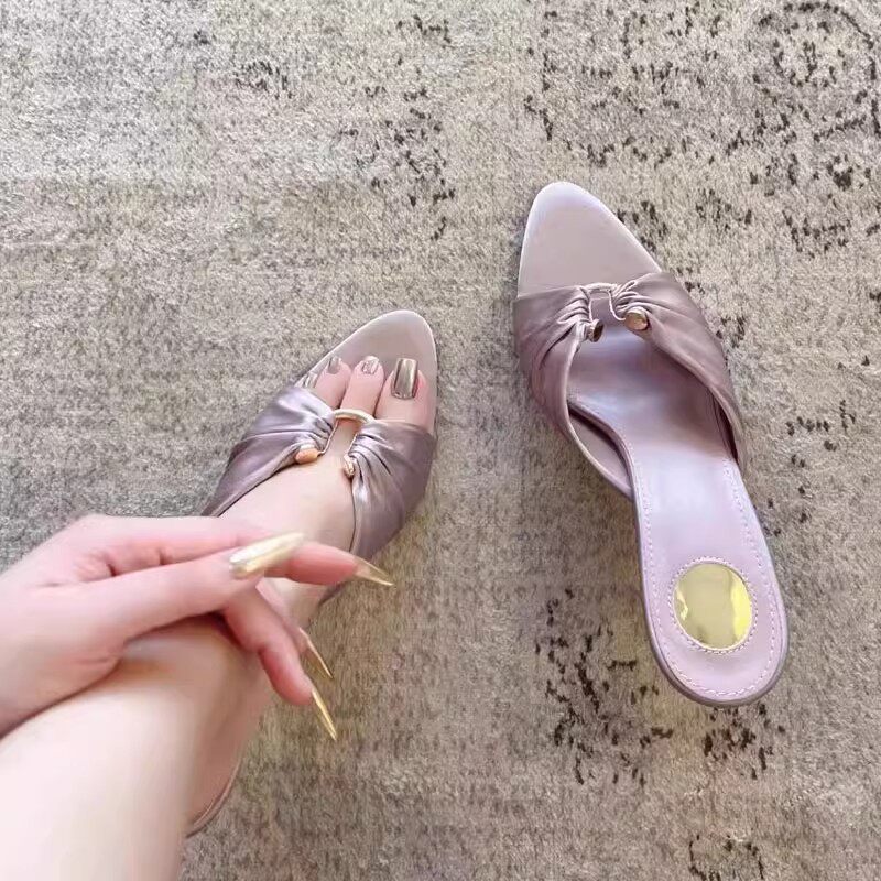 新款巨显瘦紫色尖头高跟凉拖鞋女气质金属扣褶皱性感细跟露趾凉鞋