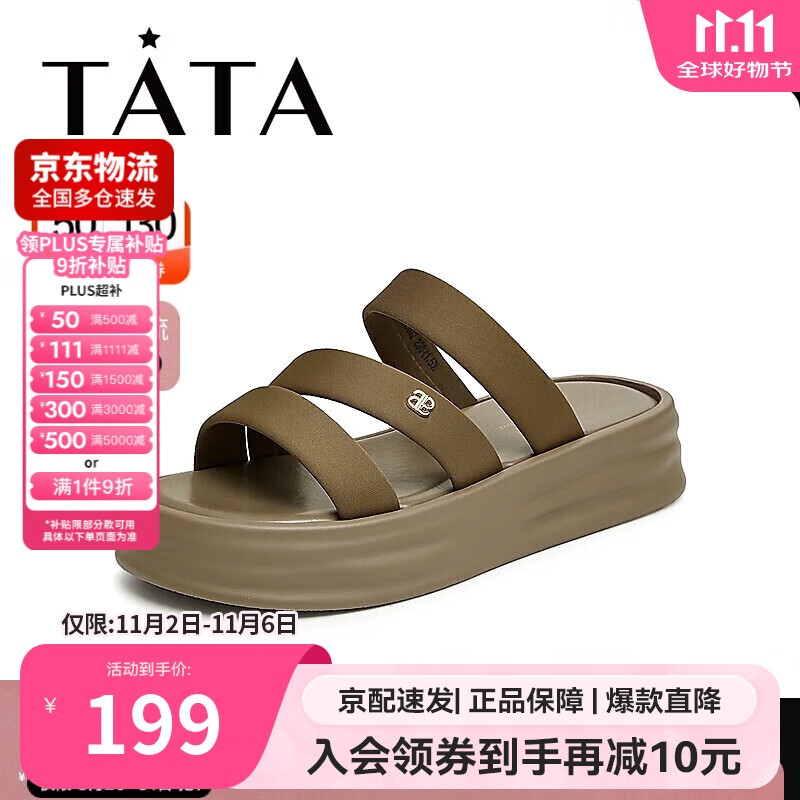 他她夏商场同款时尚女一字拖鞋WL602BT4 啡绿 35