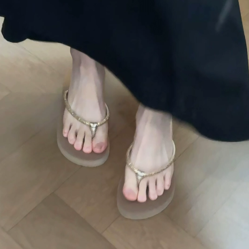 时尚水钻人字拖女外穿夏季厚底坡跟夹脚凉拖鞋法式配裙子的沙滩鞋