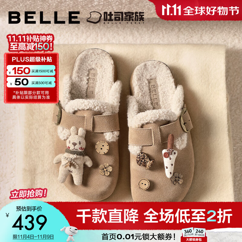 百丽(Belle)时尚卡通饰扣勃肯鞋女2025冬新加绒保暖舒适包头拖鞋E7Y1DDH5预售 杏色 37