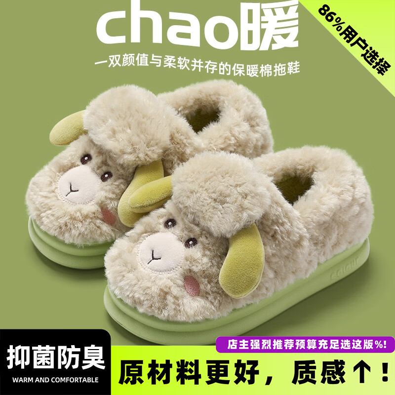 QYCKABY小绵羊棉拖鞋女冬季新款踩屎感外穿包跟保暖柔软舒适防滑棉托鞋男 绿色【2.0材质升级更舒适】 38-39 适合37-38