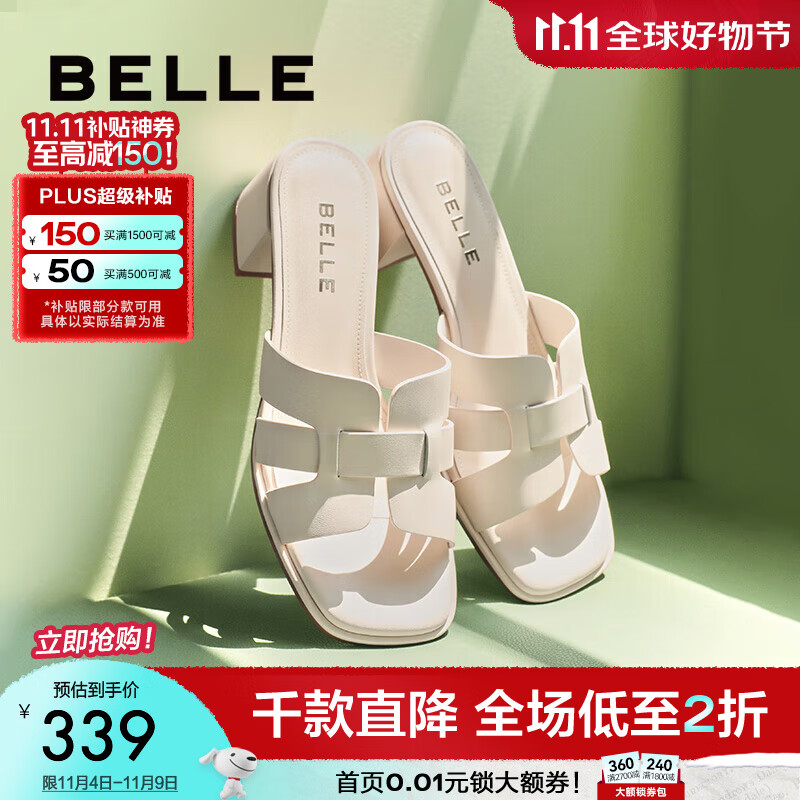 百丽(Belle)气质一字拖女商场同款真皮方头高跟拖鞋BY334BT4 米色 36 (230mm)