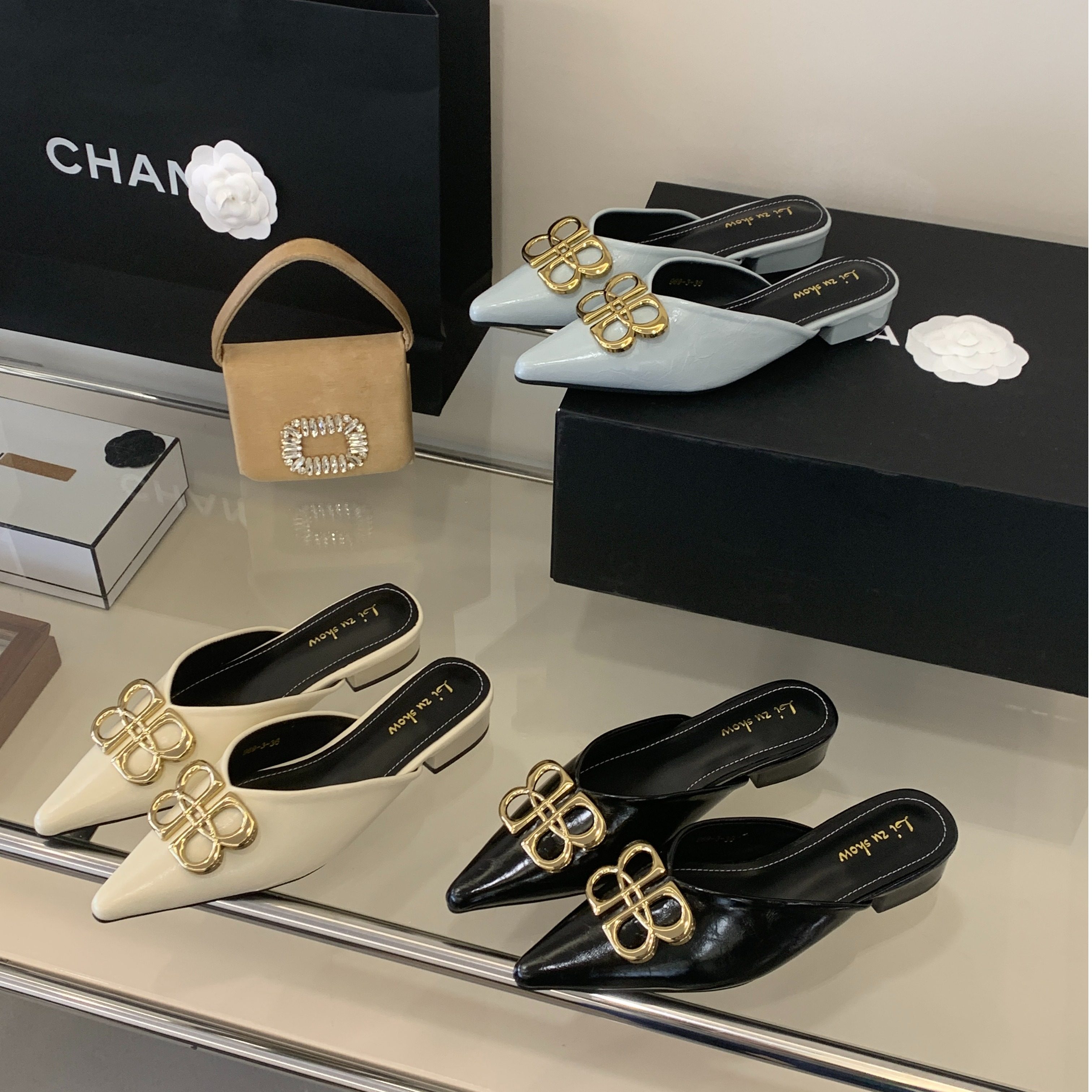 2026春夏新款法式尖头包头粗跟拖鞋女百搭金属扣复古时尚一脚蹬鞋