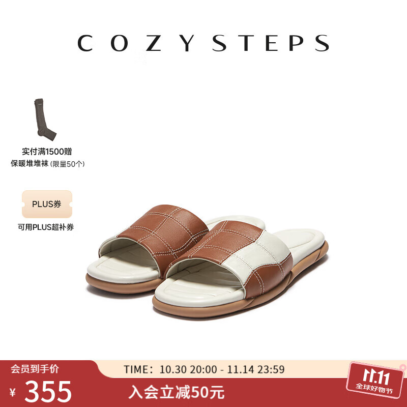 COZY STEPS可至女士夏季新款舒适透气牛皮薄底一字带平跟拖鞋6062 姜饼干+乳酪白 36