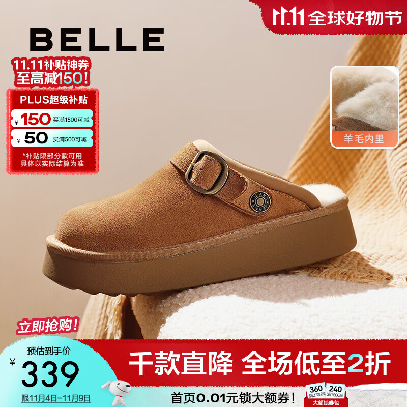 百丽(Belle)舒适休闲勃肯鞋保暖加绒毛毛鞋厚底拖鞋B2279DH4 棕色 38 (240mm)
