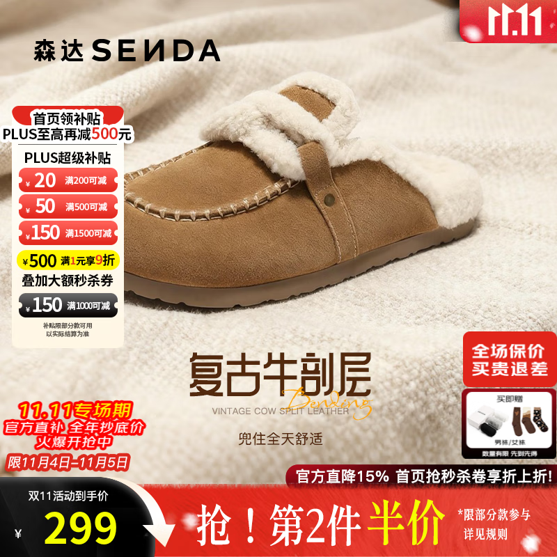 森达毛毛鞋女2025冬季新款商场同款保暖毛绒拖鞋XSR01DT5 棕色 38